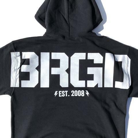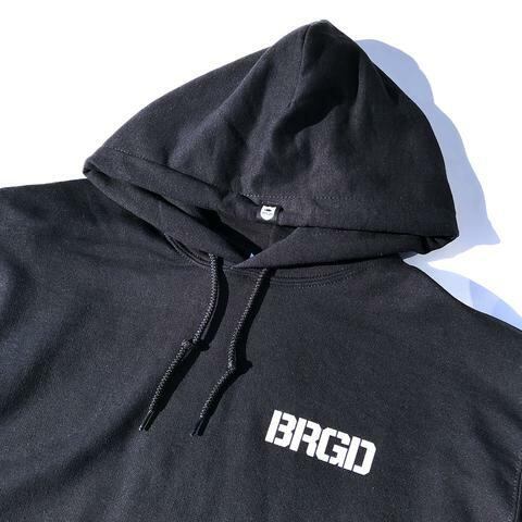 背面にボディから腕にかけて大きなBRGDロゴが配置されているプルオーバーパーカーです。